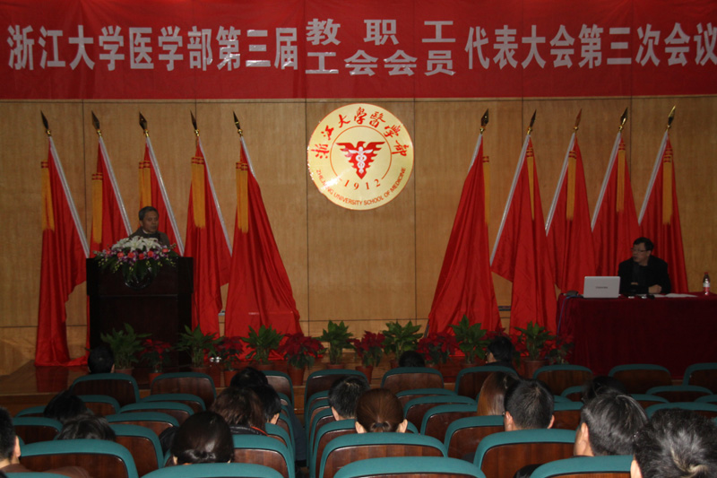 2011年12月29日下午,医学部第三届教职工大会暨第三届工会会员大会第三次会议在科研辅楼大报告厅举行,120余名“双代会”代表和列席代表参加了大会。校紫金港校区工会办公室主任俞卫东应邀出席了大会。